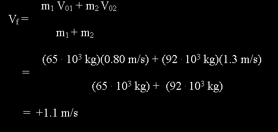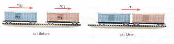 A freight train is being assembled in the switching yard, and the figure above shows twp boxcars. Car 1 has a mass of m1 = 65 . 103 kg and moves at a velocity of V01 = +0.80 m/s. Car 2, with a mass of m2 = 92 . 103 kg and velocity of V02 = +1.3 m/s, overtakes car 1 and couples to it. Neglecting friction, find the common velocity Vf of the cars after they become coupled.